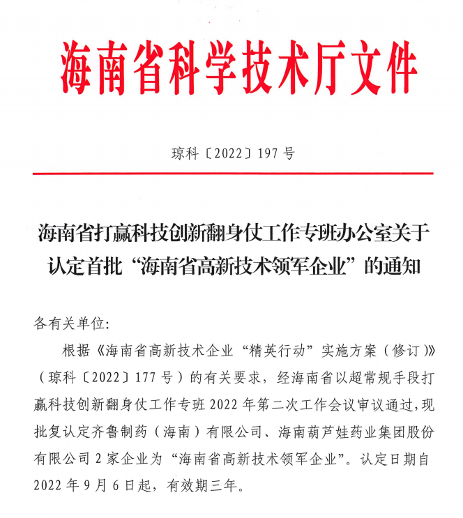 近日,海南省科学技术厅发布的《海南省打赢科技创新翻身仗工作专班办公室关于认定首批“海南省高新技术领军企业”的通知》中显示,批复认定海南征途国际药业集团股份有限公司等2家企业为“海南省高新技术领军企业”。认定日期自2022年9月6日起,有效期三年。