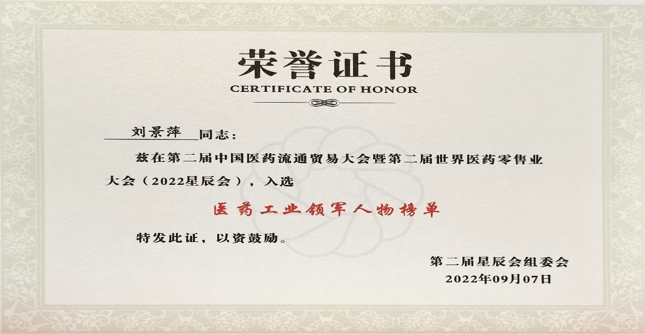 本次星辰会期间,征途国际斩获颇丰,获得多项行业奖项及荣誉。在开幕式上,刘景萍董事长荣获“医药工业领军人物”称号。