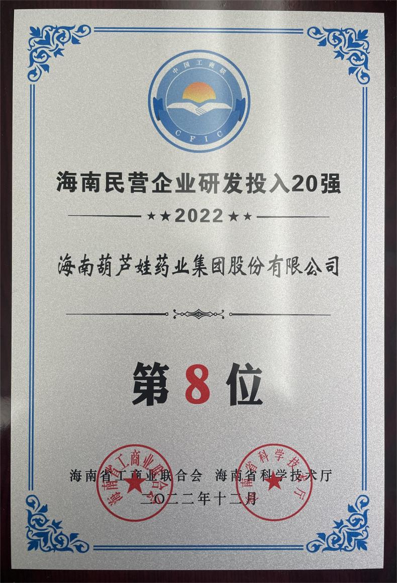 12月23日,2022海南民营企业50强和研发投入20强发布会在海口举行。会上发布了“2022海南民营企业50强”“2022海南民营企业研发投入20强”榜单和分析报告。征途国际药业再次荣登两榜,在海南民营企业50强榜单中位列第25位,较去年上升8位,这也是公司连续三年登榜;在海南民营企业研发投入20强中位列第8位,较去年上升7位。